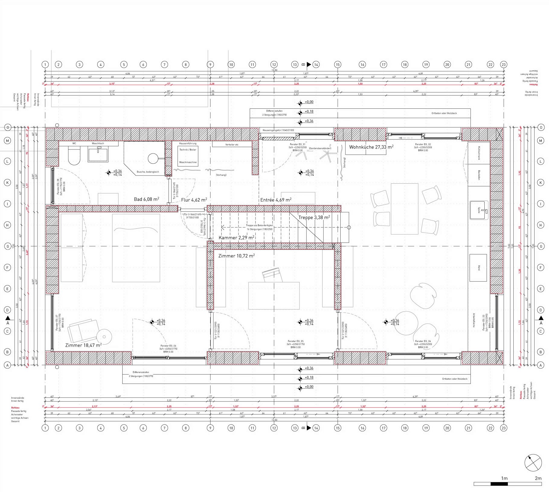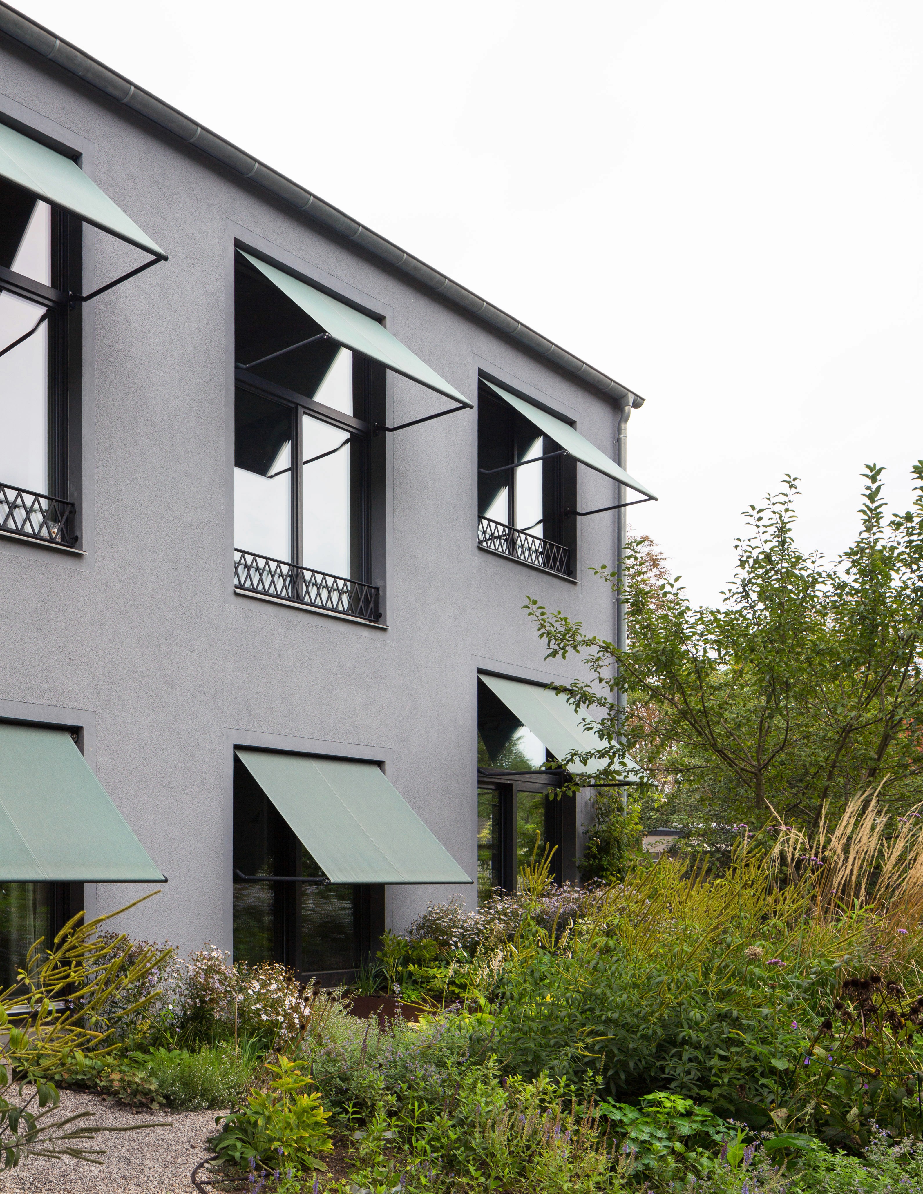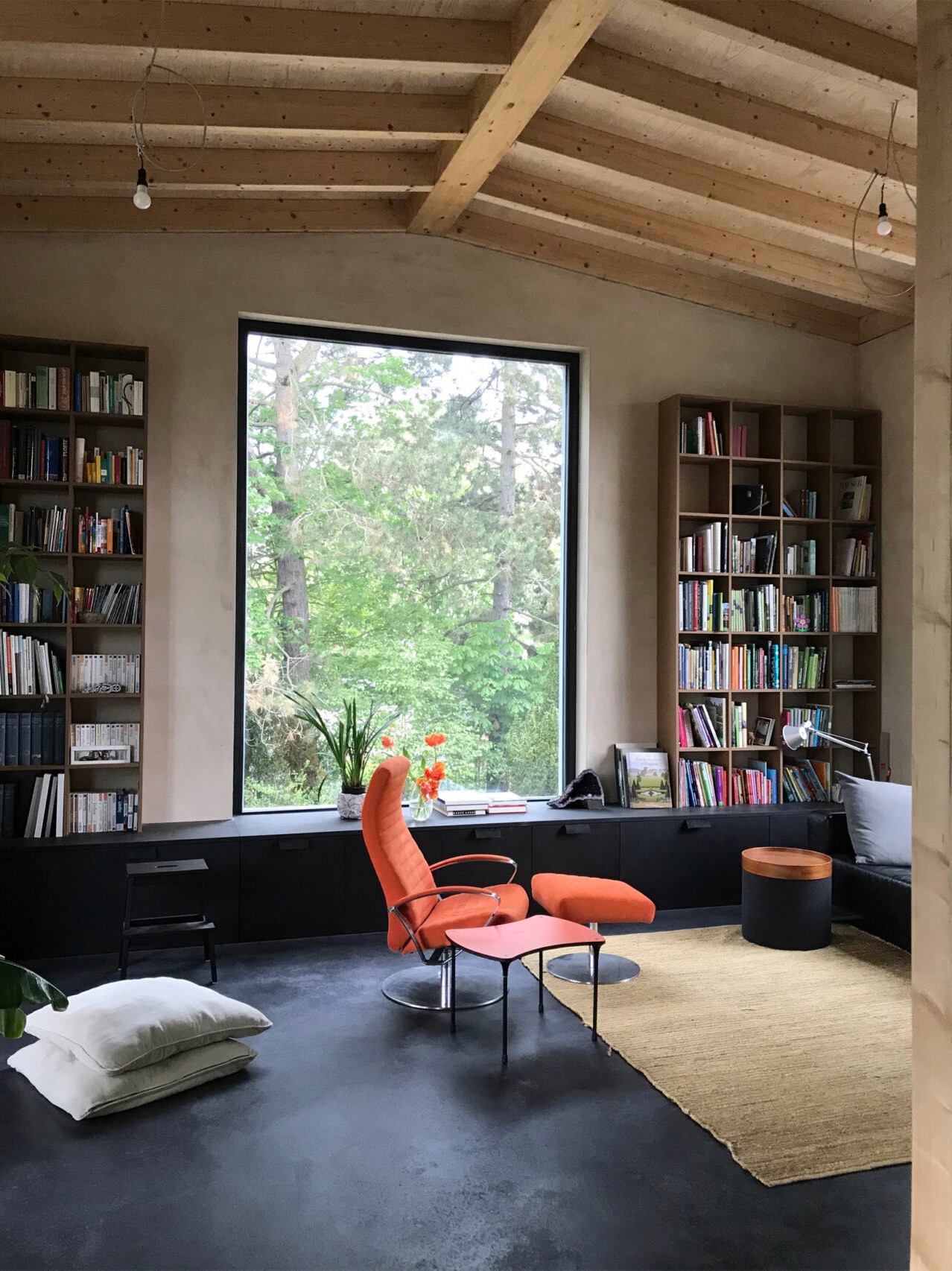 Das Wohnhaus aus einschaligem Mauerwerk bietet auf kompakter Grundfläche zwei überhohe Wohnbereiche und vier flexibel schaltbare Zimmer. Große Fenster und Sichtachsen lassen das Haus stets großzügig wirken und öffnen es zum intensiv genutzten, umliegenden Garten. Kalkputz, durchgefärbter Estrich und der sichtbar belassene Dachstuhl prägen die Innenräume.